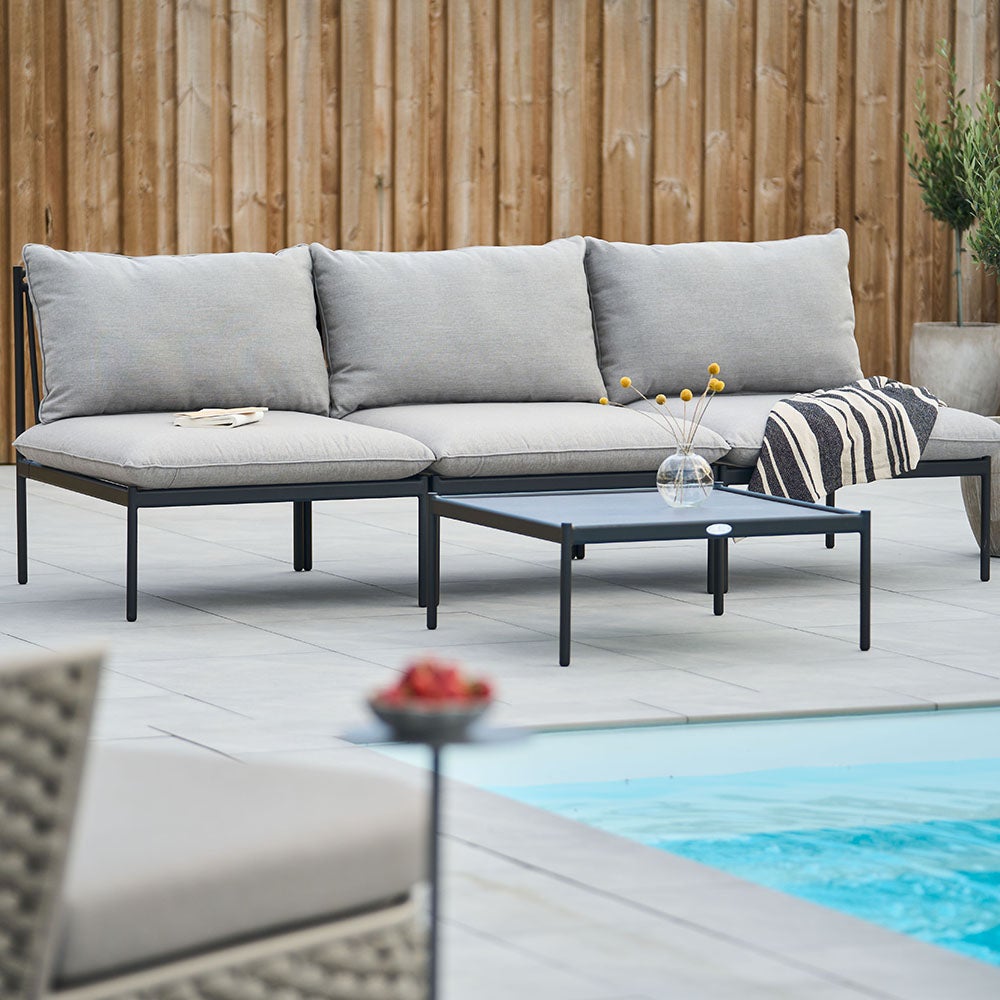 Ein modernes, stilvolles und pflegeleichtes Modulsofa. Weiche, abgerundete Profile treffen auf klares Design mit verspielter Modularität. Lässt sich ganz nach Wunsch mit Eckelementen, Mittelelementen, Divans und Tischen kombinieren. Aus lackiertem Aluminium gefertigt.